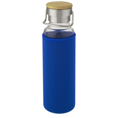 Single-walled borosilicate glass bottle with neoprene protective sleeve. Features a screw-on lid with bamboo top, as well as a handle for easy carrying. The bottle is made from 100% durable borosilicate glass which conserves the freshness of the beverage, and it does not contain any harmful chemicals. BPA-free, tested and approved under German Food Safe Legislation (LFGB). Tested and approved for phthalates content according to REACH regulations. The bamboo used is from sustainable, environmentally and socially responsible sources. Volume capacity is 660 ml. By removing the neoprene sleeve and lid the bottle is dishwasher safe. Presented in a recycled cardboard gift box.