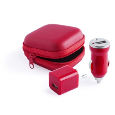 Set of USB chargers for car and wall. 1,000 mA charging capacity and in fun colors. , with charging indicators and presented in a bold and resistant leather case in matching color.