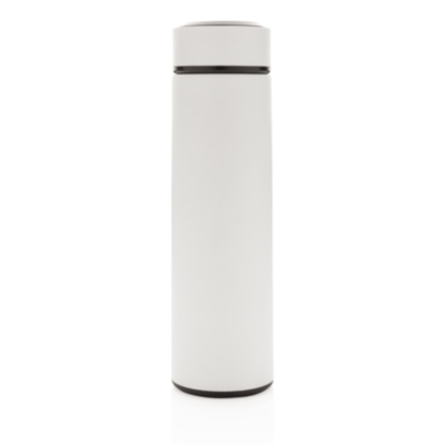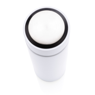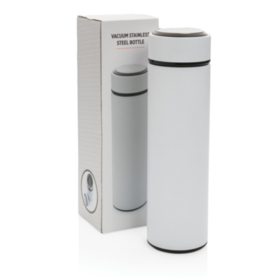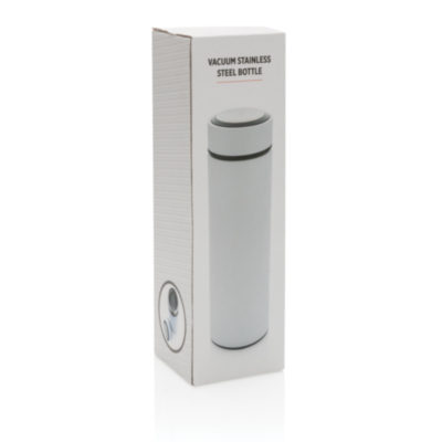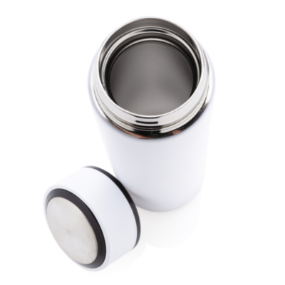 Keep coffee or tea nice and toasty in this vacuum stainless bottle with brushed metal lid. The bottle features a leak-proof screw lid and allows for drinking from any side. The wide mouth opening allows for easy cleaning. Capacity 450ml. BPA free.