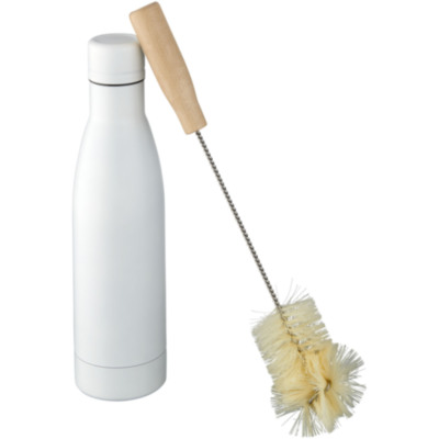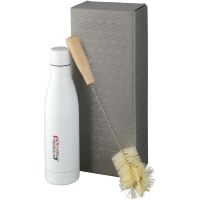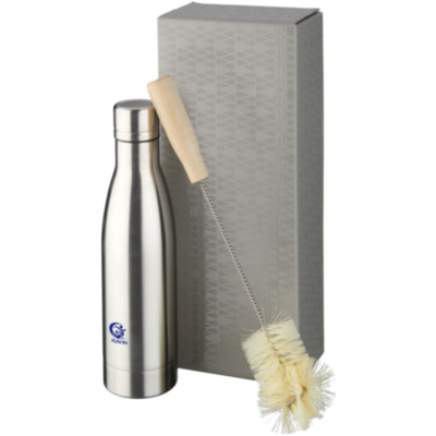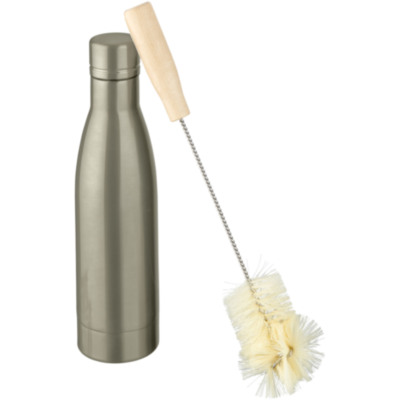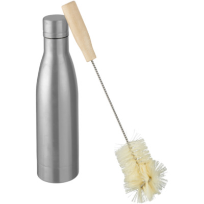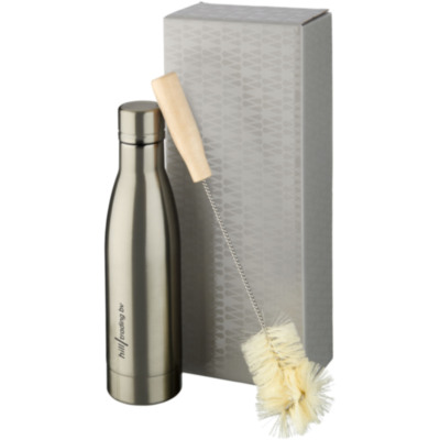 Gift set of Vasa 500 ml copper vacuum insulated bottle combined with bottle brush. Double-wall stainless steel vacuum construction with copper insulation, which allows beverages to stay cold for 48 hours or hot for at least 12 hours. Volume capacity is 500 ml. Bottle brush features wooden handle. Presented in a silver gift box.