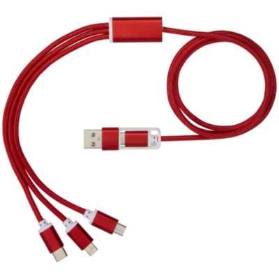 Braided nylon charging cable with 5 different connectors: Type-C input, USB-A input, Type-C output, Apple® iOS output, and micro USB output. This allows for using the cable also with Type-C output devices that are included in the newer generation of phones and MacBook computers. Cable length is 100 cm. 2-in-1 tip output up to 2A. Type-C output up to 3A current.