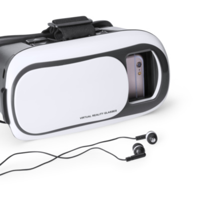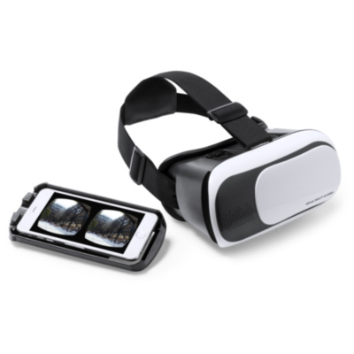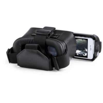 Virtual Reality glasses with adjustable lenses and tray for all types of smartphones. 3.5mm audio jack input connectors, comfortable adjustable elastic headband, and padding around the eye area for comfort. Microfiber lens cleaning cloth included. Presented in an attractive design box.