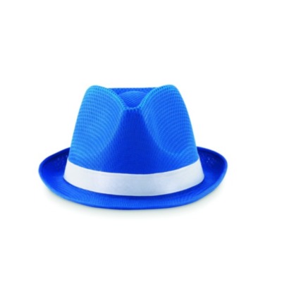 Coloured hat in polyester straw with white coloured band. For unprinted orders the band will be supplied unattached to the items