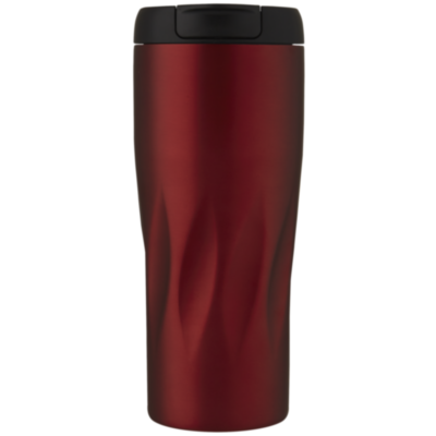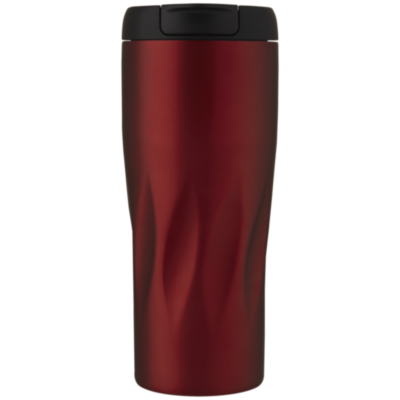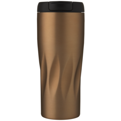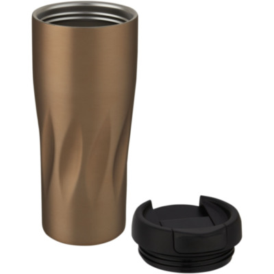 Double-walled copper vacuum insulated tumbler with screw-on leakproof lid featuring a wavy geometric design. The insulated 18/8 stainless steel keeps drinks hot or cold for several hours. BPA-free and tested and approved under German Food Safe Legislation (LFGB), and tested for phthalates content according to REACH regulations. Volume capacity is 450 ml. Hand wash recommended. Presented in a recycled cardboard gift box.