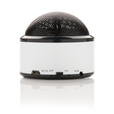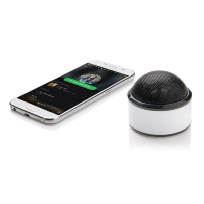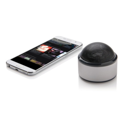 Wireless speaker with 3W speaker and 350 mAh battery. Because of its clever design the music will be played in all directions. Aluminium body and metal grill, the bottom of the speaker has rubber strips for improved sound quality and grip. Playing time up to 3 hours on one single charge and connection distance up to 10 metres. Includes micro cable to charge the speaker and audio cable to connect the device to your mobile phone without wireless connection. Compatible with all mobile phones.
