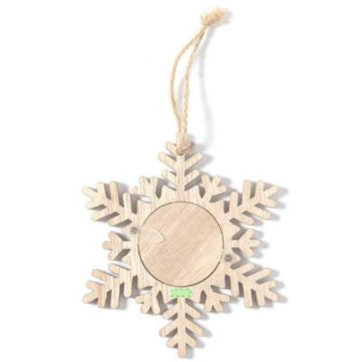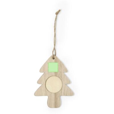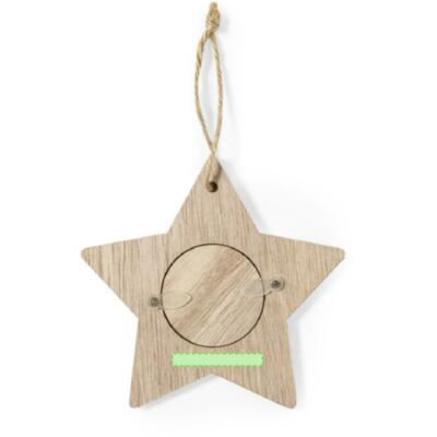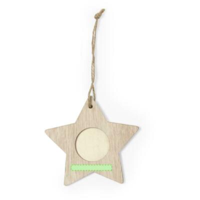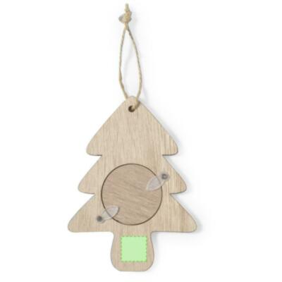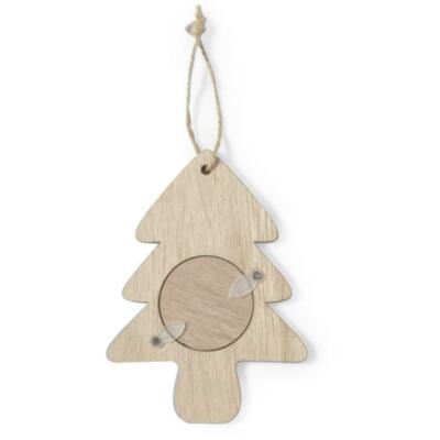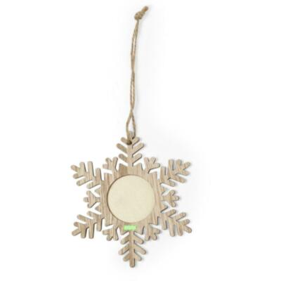 Elegantes adornos navideños con portafotos fabricados en suave madera. Incluye ventana para fotografías en tamaño 4x4 cm y accesorio para colgar en yute natural. Disponible en 3 originales diseños: Copo de Nieve, Árbol de Navidad y Estrella. Presentado en bolsa individual reciclada.Elaborado con elementos vegetales para así fomentar la utilización de materias primas naturales y reducir las emisiones contaminantes.