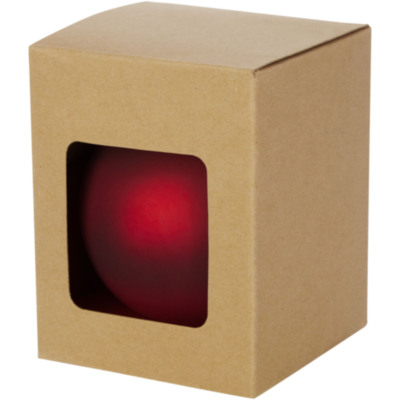 Adorno navideño con acabado brillante, un colgador redondo y un cordel de 5,5 cm. Caja de regalo individual de papel kraft con apertura frontal para visualizar la grabación.