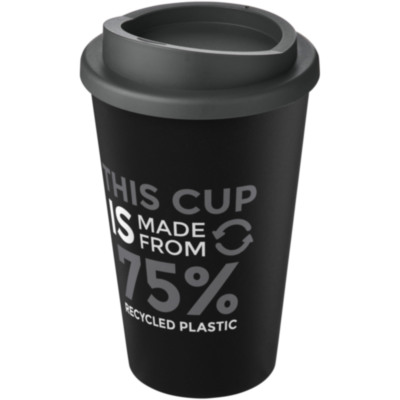 Vaso con aislamiento de doble capa con tapa de rosca. El vaso está hecho de plástico de polipropileno 75 % reciclado, con una capa interior negra, mientras que la tapa está hecha de plástico de polipropileno de grado alimenticio. Dado que la tapa no está hecha de material reciclado, está disponible en una amplia gama de colores diferentes. Los tonos en negro o blanco pueden variar, la opción blanca tiene un efecto de textura y puede incluir tintes de color debido a la naturaleza del material reciclado. Capacidad de 350 ml. Fabricado en el Reino Unido. Embalado en una bolsa compostable. Sin BPA y apto para lavavajillas.