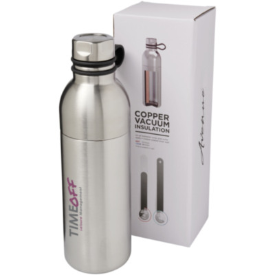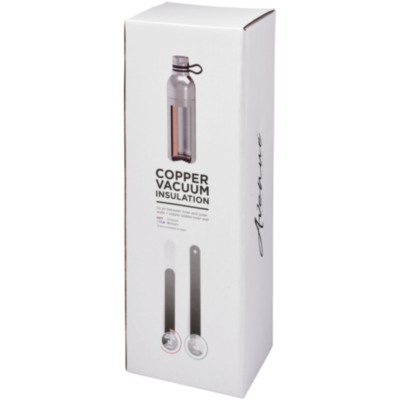 Construcción al vacío de acero inoxidable duradero, de doble pared, con aislamiento de cobre, que conserva las bebidas frías durante 48 horas y calientes durante al menos 12 horas. La construcción también impide la condensación en el exterior del bidón. Cuenta con parte superior de rosca y tapa de acero inoxidable con un asa cómoda de silicona. Construcción de doble abertura para una fácil limpieza y llenado. Capacidad de 590ml. Se presenta en una caja de regalo "Avenue".