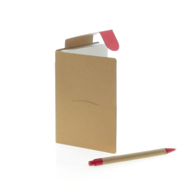Bloc de notas adhesivas con bolígrafo de cartón reciclado a juego incluido. De original diseño bicolor, tapas de suave tacto con autocierre de tira en parte superior a juego y acabadas en resistente cartón reciclado rígido. Con soporte para el bolígrafo integrado en lomo, 70 hojas lisas, 25 notas adhesivas grandes, 25 medianas y 100 mini notas adhesivas.