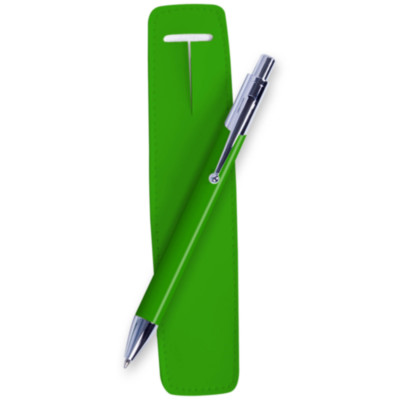 Bolígrafo de mecanismo pulsador en original diseño bicolor. Con cuerpo metálico de suave acabado en alegres colores. Punta y clip en plateado. Presentado en funda de polipiel a juego. De cartucho jumbo y tinta azul.