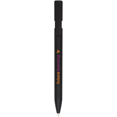 Un bolígrafo negro con detalles en colores llamativos. Incorpora un mecanismo de clic.