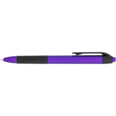 Un bolígrafo con mecanismo de clic, acabado metálico y agarre revestido de goma.