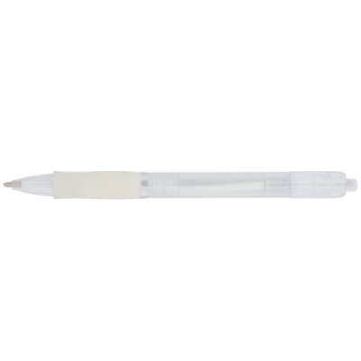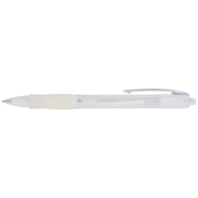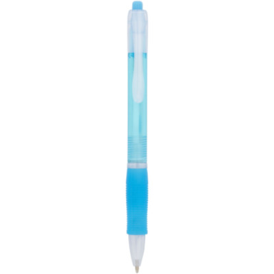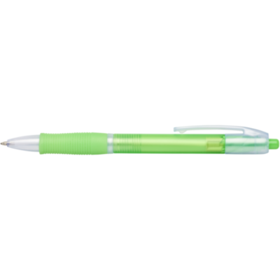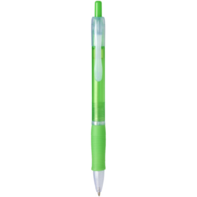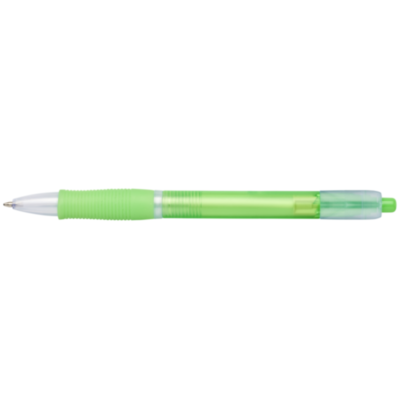 Un bolígrafo colorido con mecanismo de clic, caña transparente y agarre revestido de goma en color a juego.