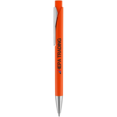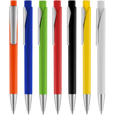 Bolígrafo con caña levemente cuadrada y mecanismo de clic.