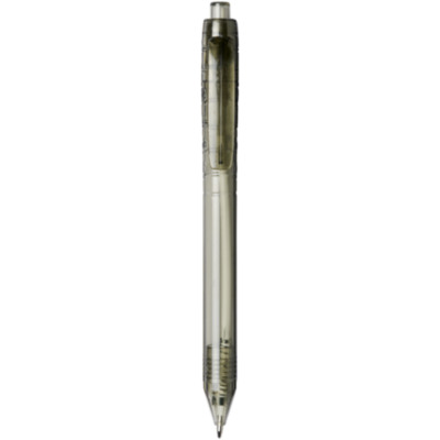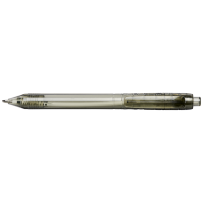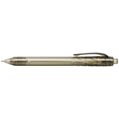 Bolígrafo con mecanismo de clic y cuerpo transparente. El cuerpo está fabricado con botellas de agua recicladas, lo que contribuye a reducir la cantidad de residuos plásticos.