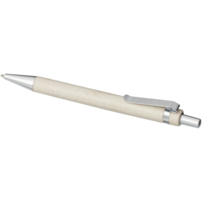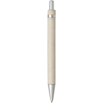 Bolígrafo con mecanismo de presión de estilo moderno, con cuerpo de paja de trigo y acabado con llamativos detalles en color cromo. La paja de trigo es el tallo que queda después de cosechar los granos de trigo, lo que reduce la cantidad de plástico utilizado.