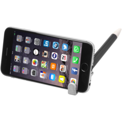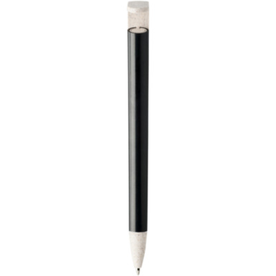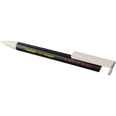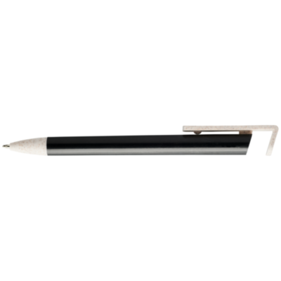 Bolígrafo de paja de trigo con mecanismo de clic. La paja de trigo es el tallo que queda después de cosechar los granos de trigo, lo que reduce la cantidad de plástico utilizado. La parte superior del bolígrafo sirve también como soporte para smartphone al facilitar la visualización en modo manos libres.