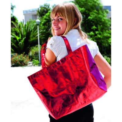 Bolsa en non-woven laminado de acabado metalizado de 110g/m2, en variada gama de vivos colores. Con asas reforzadas medianas de 55cm, fuelle y acabado cosido. Resistencia hasta 9kg de peso.