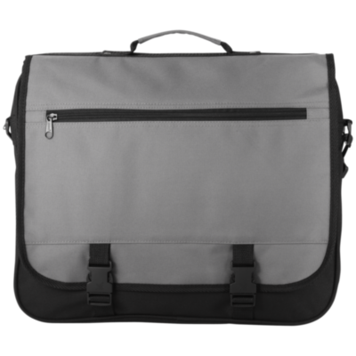 Una bolsa de exposiciones con hombrera ajustable, solapa con cierre de hebilla, bolsillo con cremallera en la solapa, compartimento principal con cremallera y varios bolsillos abiertos bajo la solapa.
