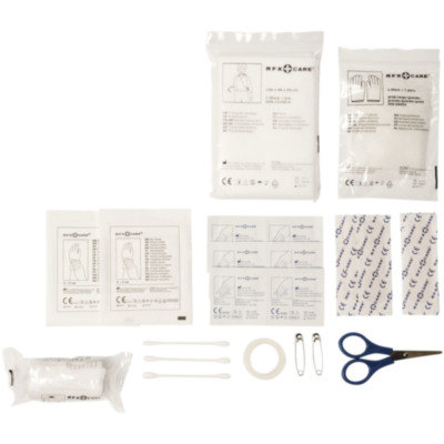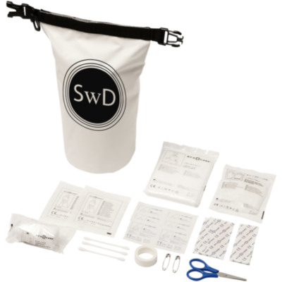 Bolsa impermeable de lona resistente y duradera con 30 elementos de primeros auxilios. El kit contiene un par de tijeras (9 cm), 1 venda elástica (4 metros x 6 cm), 2 toallitas secas (5x5 cm), 6 toallitas limpiadoras, 1 venda triangular (136x96x96 cm), 1 cinta adhesiva (1,25 cm x 5 metros), 1 par de guantes (5,5 g), 3 bastoncillos de algodón (8 cm), 2 imperdibles (3,6 cm) y 12 tiritas (7,2x1,9 cm). El cierre con hebilla de plástico garantiza que el contenido se mantiene seco y seguro. Ideal para deportes acuáticos y otras actividades al aire libre. Los botiquines de primeros auxilios permiten tratar heridas de forma sencilla para reducir lesiones secundarias. Un botiquín de primeros auxilios se considera un producto sanitario y se rige por la Directiva 93/42/CEE, en función del uso previsto: «Diagnóstico, prevención, control, tratamiento o alivio de enfermedades». Este dispositivo médico es de Clase I.