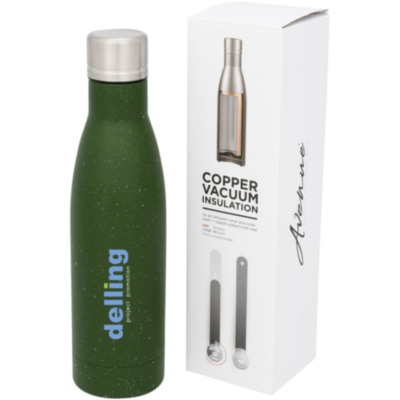 Mantén tus bebidas calientes durante 12 horas o frías durante 48 horas con el bidón de cobre moteado con aislamiento al vacío Vasa. De doble capa y fabricada en acero inoxidable con aislamiento al vacío y una capa interior de cobre, que permite mantener la bebida bien caliente o fría en función de tus necesidades. Tiene un acabado moteado muy moderno. No contiene BPA y ha sido probada y aprobada por la legislación alemana sobre seguridad alimentaria (LFGB) y por REACH en cuanto al contenido de ftalatos. Capacidad: 500 ml. Se entrega en una caja de regalo.