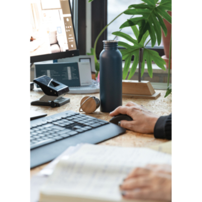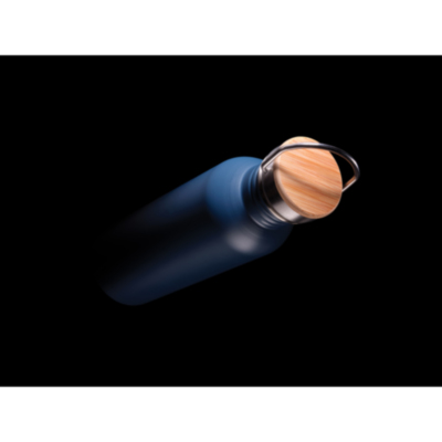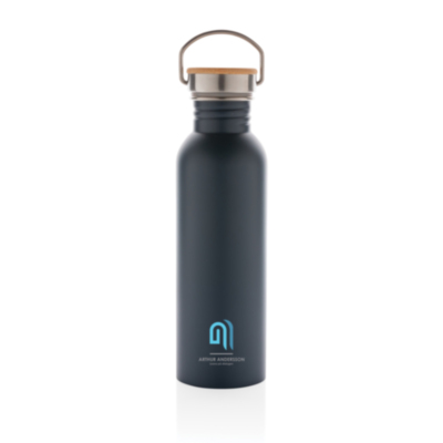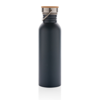 Botella moderna de acero inoxidable con tapa de bambú.