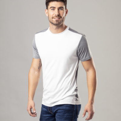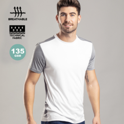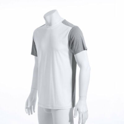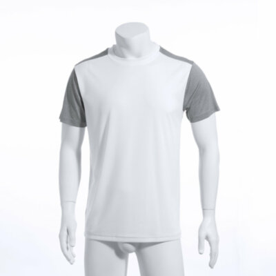 Camiseta técnica para adulto en material transpirable poliéster/elastano de 135g/m2. De elegante diseño bicolor, con frontal en color blanco, espalda detalles en gris. Disponible en tallas S, M, L, XL, XXL. Color blanco especialmente fabricado para marcaje en sublimación.