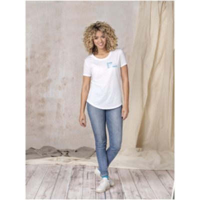 Ropa promocional sostenible. Cuello redondo. Costuras laterales. Faldón trasero. Tapacosturas de hombro a hombro. Doble pespunte de aguja.