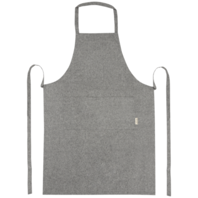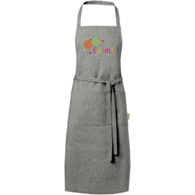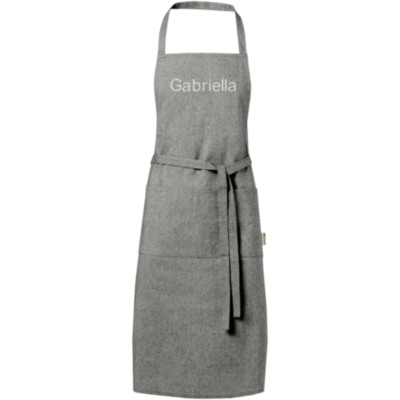 Delantal de mezcla de algodón reciclado y poliéster de 200 g/m². Dispone de 2 bolsillos adyacentes con un tamaño combinado de 45 x 20 cm, y una cinta de 1 metro para atarlo en la parte trasera. El algodón reciclado se fabrica a partir de los residuos preconsumo generados por las fábricas textiles durante el proceso de corte. Debido a la naturaleza del algodón reciclado, puede haber una ligera variación de color. Esta característica le añade claramente una apariencia más auténtica. Longitud de la cinta para el cuello: 55 cm.