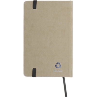 Cuaderno A6 de tapas duras de papel reciclado. Encuadernado en cartoné. 192 páginas de papel reciclado normal (96 hojas). Cinta elástica de cierre y marcapáginas de cinta. FSC®-certified | FSC MIX CREDIT, P7.1, FSC-C213206