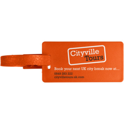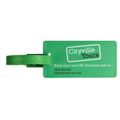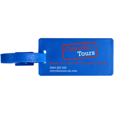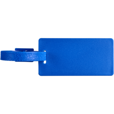 Etiqueta de equipaje resistente complementado con encarte de papel extraíble, funda protectora transparente y correa de plástico a juego. .
