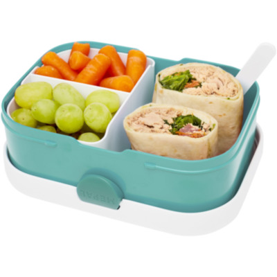 Fiambrera con un bol y un tenedor. Adecuada para 4 sándwiches. Fácil de abrir y limpiar. La capacidad es de 750 ml. Apta para lavavajillas. Sin BPA. Garantía Mepal de 2 años.