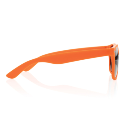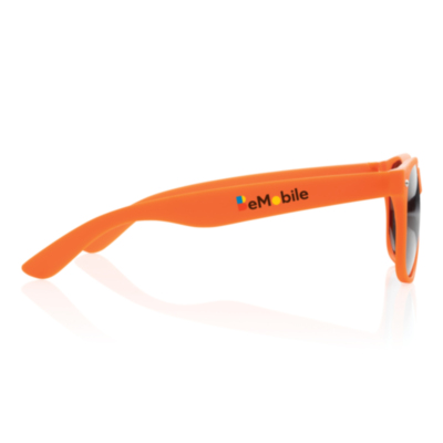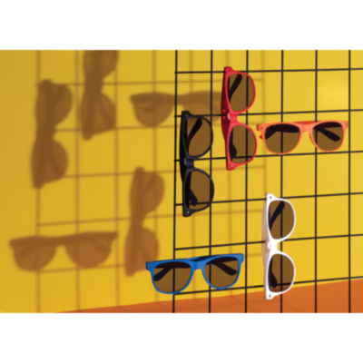 Gafas de sol de PP con lentes AC negras con UV 400. Con tornillos metálicos en las bisagras para mayor estabilidad.