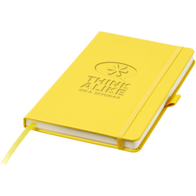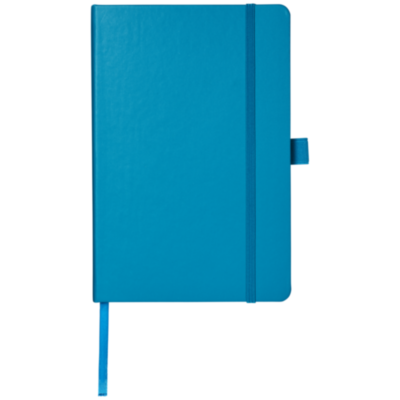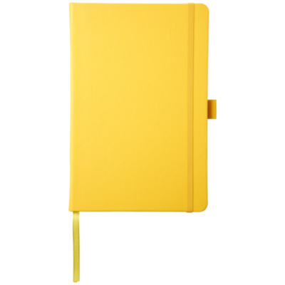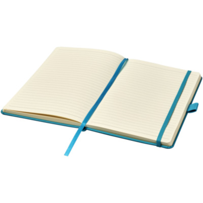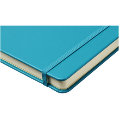 Libreta A5 (14,2 cm x 21,4 cm) de imitación a piel (piel sintética) con cinta elástica, cinta marcapáginas, soporte para bolígrafo y bolsillo trasero de acordeón. Incluye 96 hojas de papel rayado en color crema de 70 g/m² y se entrega en una funda blanca "Journalbook".