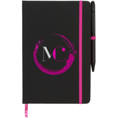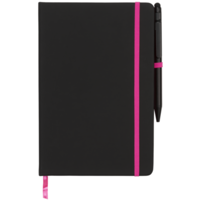 Una moderna y elegante libreta negra con una suave tapa táctil. Se suministra con ribetes de color y marcapáginas, soporte para bolígrafo y tira de cierre a juego. Se suministra con un bolígrafos-stylus de color negro. Contiene 96 hojas (70 g/m2) de papel rayado en tono crema.