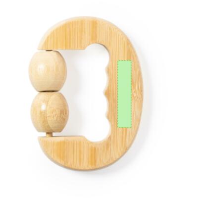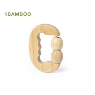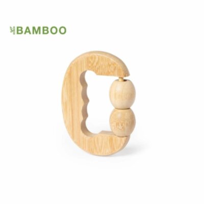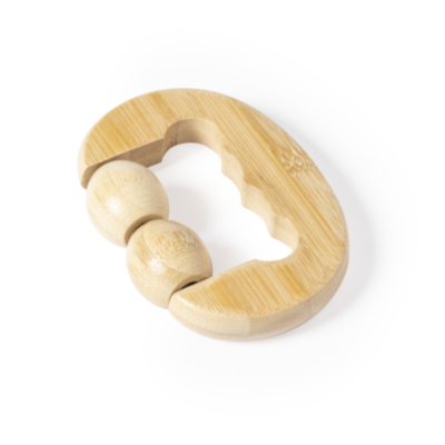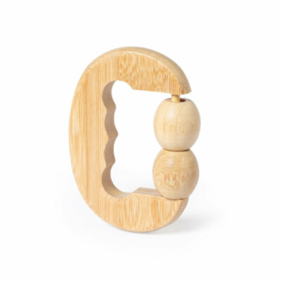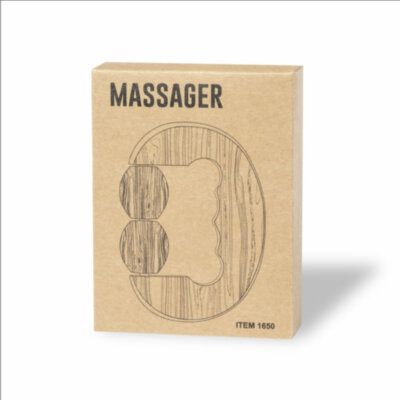 Masajeador de línea nature, fabricado en en bambú. Con 2 bolitas masajeadoras a juego y asa ergonomica. Presentación en caja individual de diseño kraft.