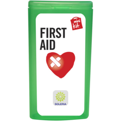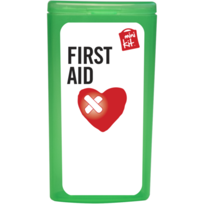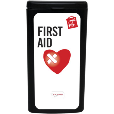 Kit básico de primeros auxilios. Ideal por su tamaño para llevar siempre encima y estar preparado para pequeñas heridas. Contenido: 5 apósitos adhesivos resistentes al agua, 2 toallitas limpiadoras. Todos los complementos de primeros auxilios cumplen todas las normativas de la UE. El precio incluye impresión a todo color en la etiqueta.