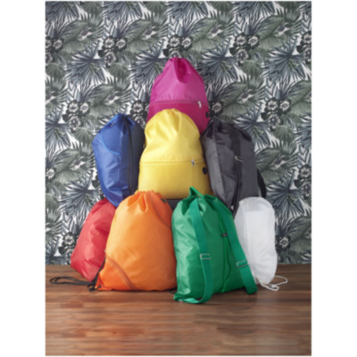 Mochila de cuerdas con compartimento principal con cierre de cuerdas en color a juego. Cuenta con 2 pequeños bolsillos delanteros de malla (1 con cierre de cremallera y 1 con velcro) y un puerto para auriculares. Resistencia para hasta 5 kg de peso.