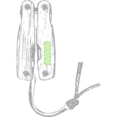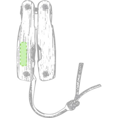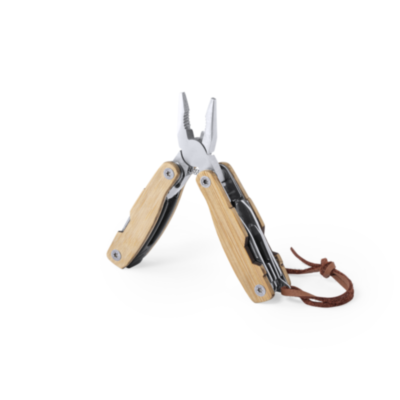 Multiherramienta con resistente cuerpo en acero inox y empuñadura de bambú, con 12 funciones. Incluye cuchillos y navajas destornilladores, limas abridores y alicates. Con cinta para transporte en polipiel y presentada en caja individual.