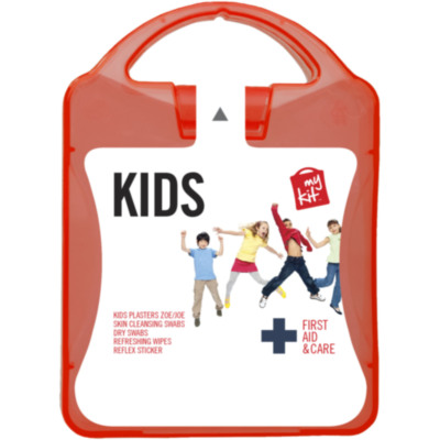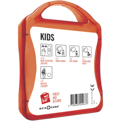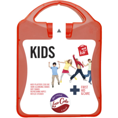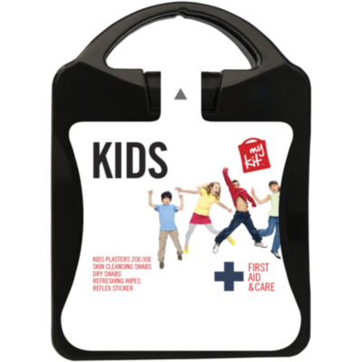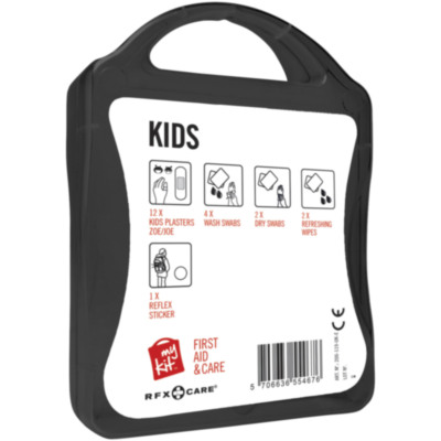 Kit ideal para ambientes con niños. Con este kit estarás preparado para pequeños accidentes. Contenido: 12 apósitos adhesivos infantiles, 4 toallitas limpiadoras, 2 toallitas secas, 2 toallitas refrescantes, 1 reflex sticker. Todos los complementos de primeros auxilios cumplen todas las normativas de la UE. El precio incluye impresión a todo color en la etiqueta.