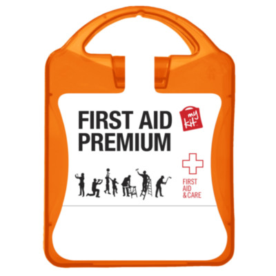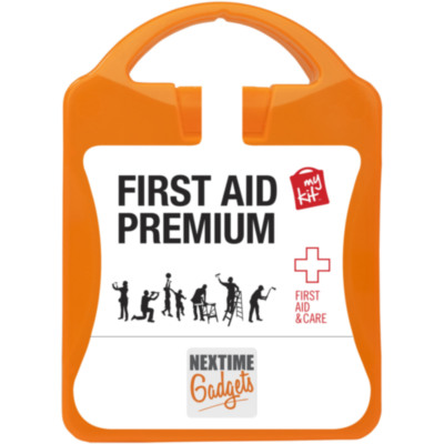 Este completísimo kit de primeros auxilios es ideal para tener a mano en casa y estar preparado para tratar heridas o emergencias. Contenido: 1 guía de primeros auxilios, 1 adhesivo para ampollas, 12 apósitos adhesivos resistentes al agua, 1 pinza de metal, 1 tijeras, 1 bendaje triangular, 1 par de guantes deshechables, 2 vendas compresoras, 1 vendaje esterilizado, 2 toallitas secas, 4 toallitas limpiadoras, 1 protector boca a boca. Todos los complementos de primeros auxilios cumplen todas las normativas de la UE. El precio incluye impresión a todo color en la etiqueta.