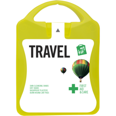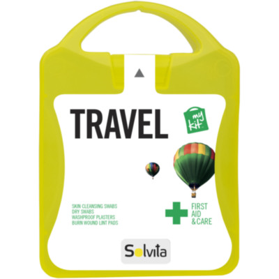 Kit de primeros auxilios básico para los viajeros. Con él estarás preparado para tratar cualquier pequeña herida durante tu viaje. Contenido: 12 apósitos adhesivos resistentes al agua, 4 toallitas limpiadoras, 2 toallitas secas, 2 gasas para quemaduras. Todos los complementos de primeros auxilios cumplen todas las normativas de la UE. El precio incluye impresión a todo color en la etiqueta.