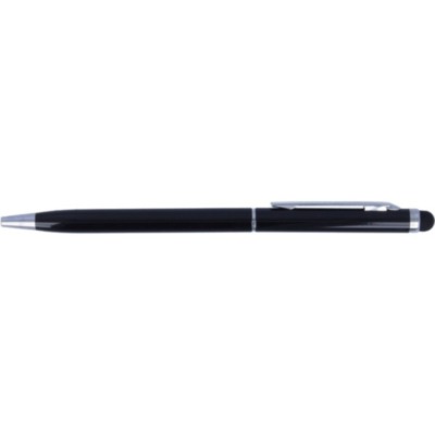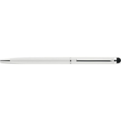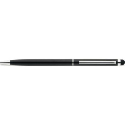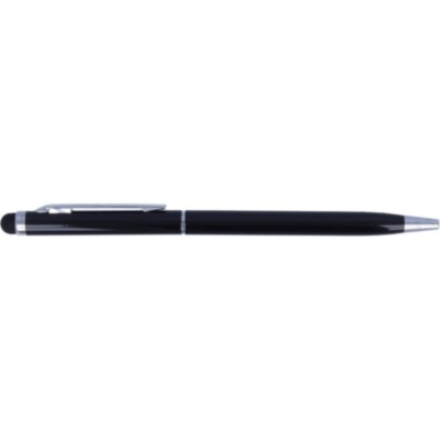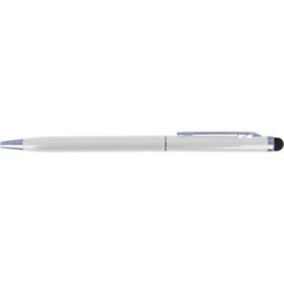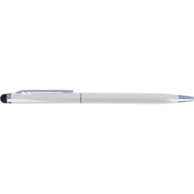 Bolígrafo giratorio en aluminio con clip en color cromado brillante y puntero para pantallas táctiles. Tinta azul.