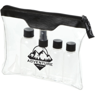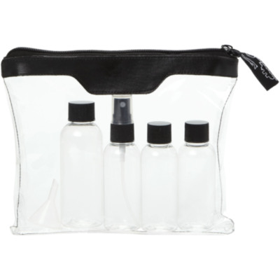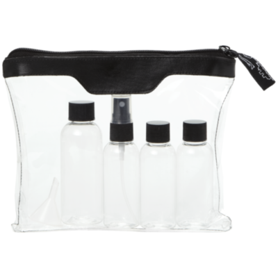 Este neceser apto para el avión permite llevarlo a bordo contigo. Incluye 2 botes de 50 ml, 1 bote de 90 ml, 1 pulverizador y 1 embudo. Los botes, el pulverizador y el embudo se entregan en una bolsa de plástico, separados del neceser. No permite la grabación de los componentes.