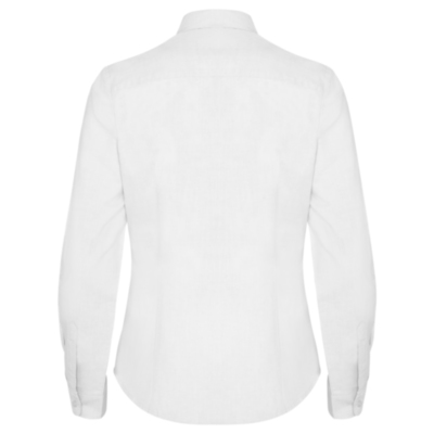Camisa de mujer con bolsillo en pecho izquierdo. Tapeta con botones. Cuello abotonado. Puño con dos pinzas. Espalda con canesú. Pinzas de pecho y forma entallada.