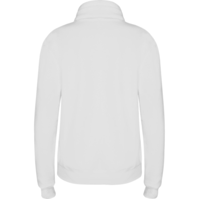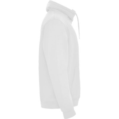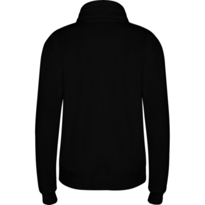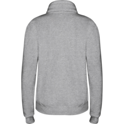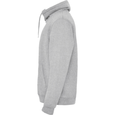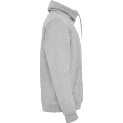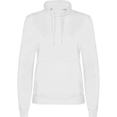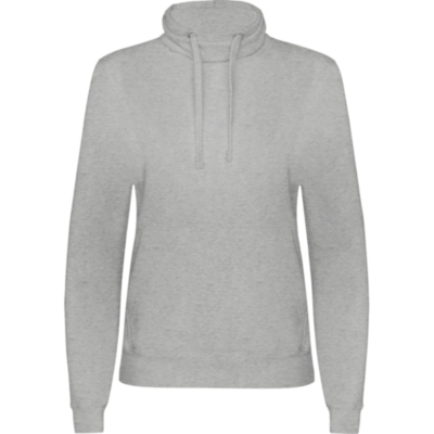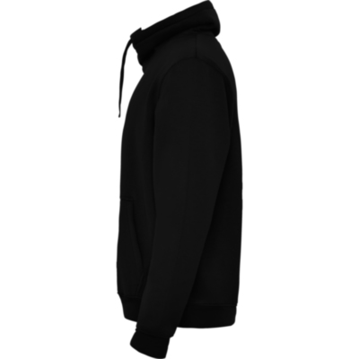Sudadera con cuello estilo chimenea, cordón ajustable y bolsillo canguro. Punto canalé con elastano 1x1 en puños y cintura.
