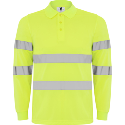 Polo técnico manga larga de alta visibilidad. Con tapeta a 3 botones. Cuello y puños en punto canalé 1x1. Dos bandas reflectantes horizontales en torso y mangas. Tejido anti enganches.