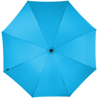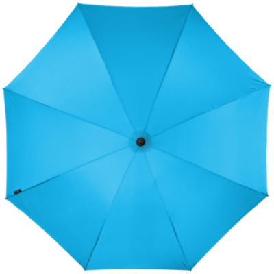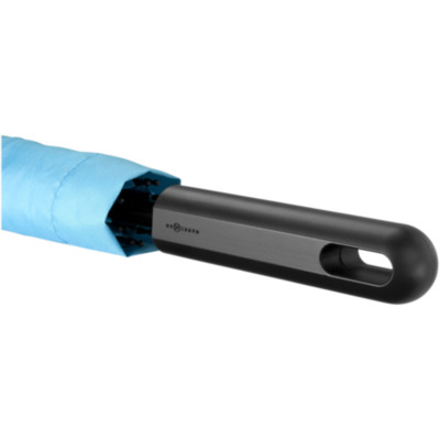 Un paraguas de diseño exclusivo con eje de metal, varillas de fibra de vidrio y puño de plástico cubierto de goma. Incluye una bolsa en color a juego con el dosel.