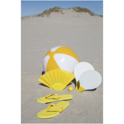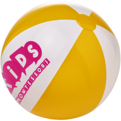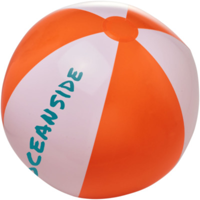 Pelota de playa hinchable bicolor. Cuando está inflada, su diámetro es de 40 cm, mientras que desinflada mide 52 cm de largo. El texto de advertencia obligatorio está impreso alrededor de la válvula de seguridad. Amplia zona de impresión en los paneles blancos o de color para una máxima visibilidad del logotipo. Cumple con la normativas EN-71, REACH y POP.